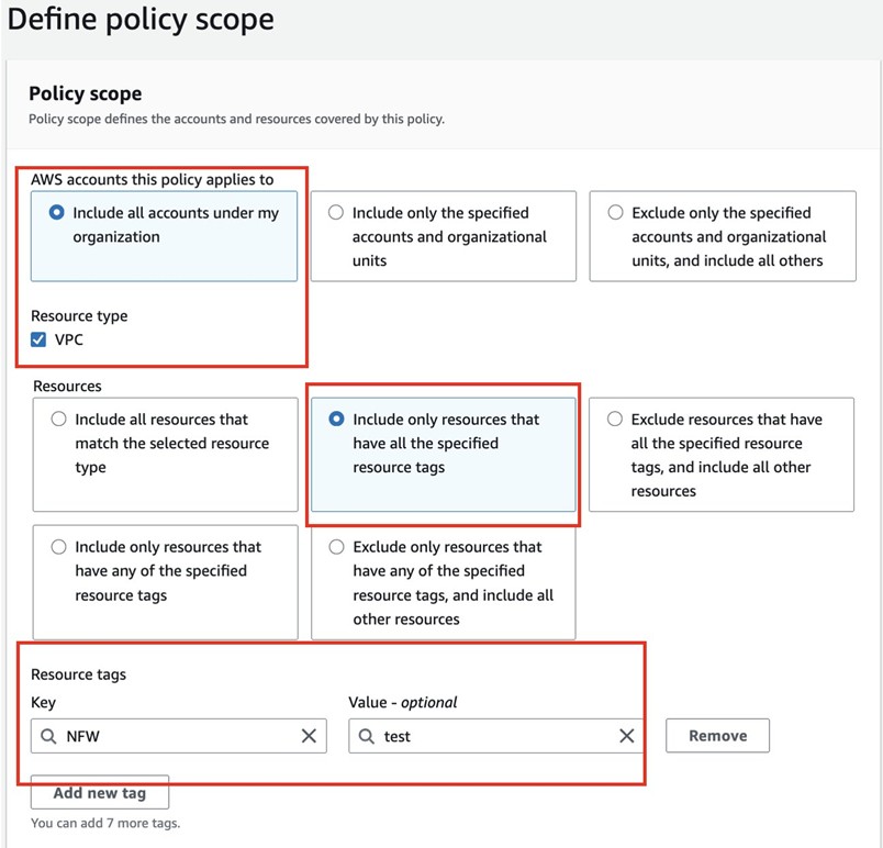 在此 Org 下的所有 account 都适用此 Firewall Manager 定义的 Policy ,对于具体的 Resource 如 VPC 中,定义了 Tag 为 NFW , test 的 VPC ,适用此 Policy ,即会为所有账号下的所有打了此 Tag 的 VPC ,创建 NFW 。