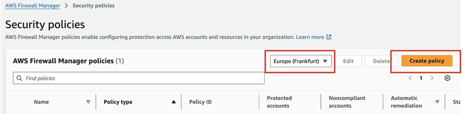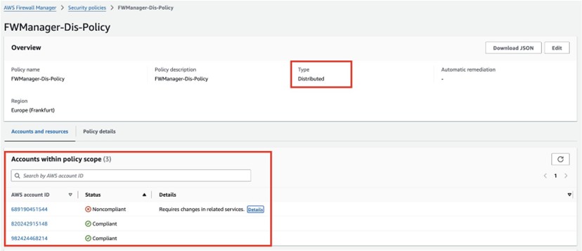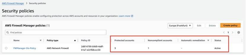 Firewall Manager管理员在 Frankfurt region 创建的 policy ,该 Org 中的 3 个账号受到此 policy 管理并配置。