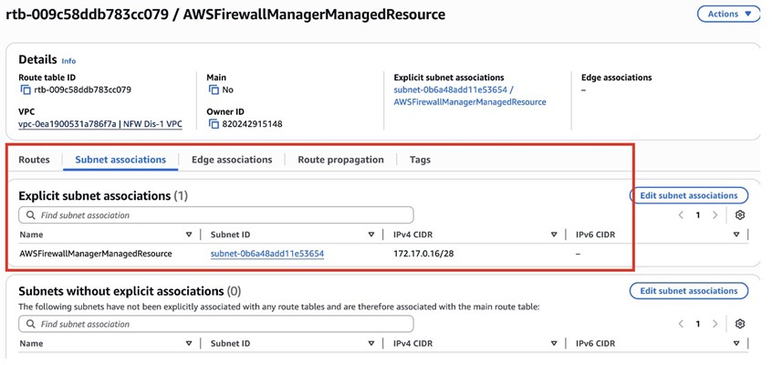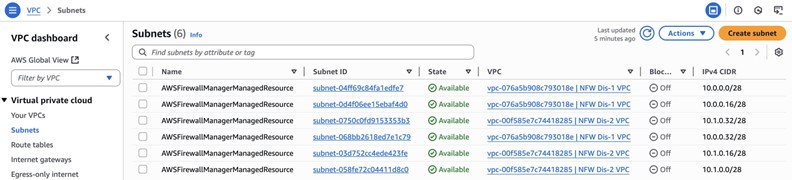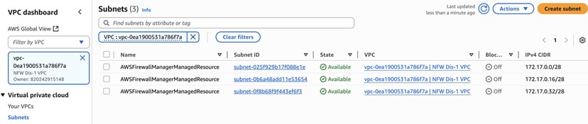 符合 Policy Scope 定义的 VPC (打了 Tag NFW , test ), Firewall Manager 会自动创建 EP 子网 /28.
