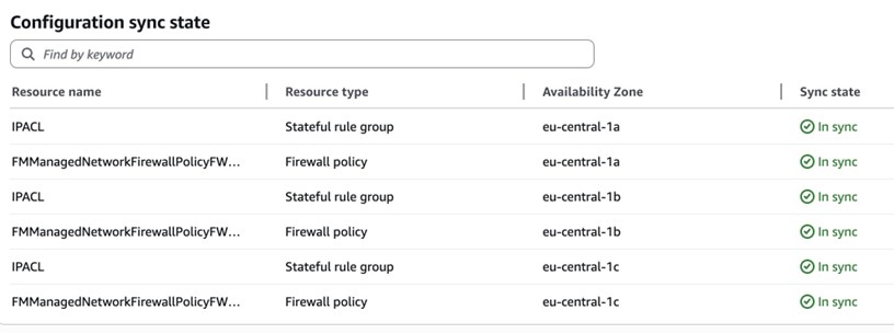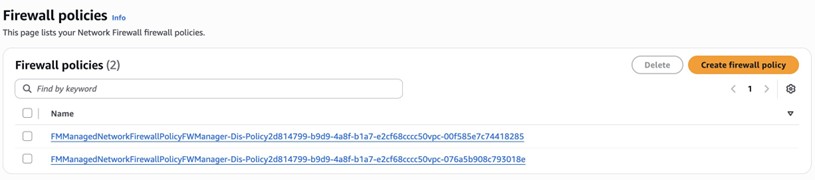 在等待一段时间后, AWS Config 会自动给新添加的 VPC 配置 NFW ,可以看到会创建多个 NFW 及 Policy ,他们是 1:1 对应的