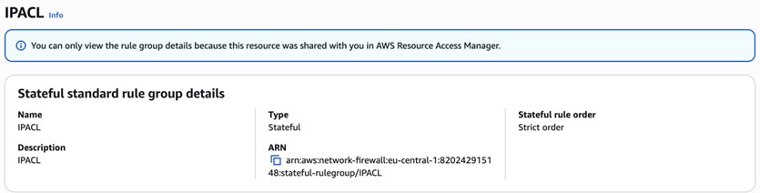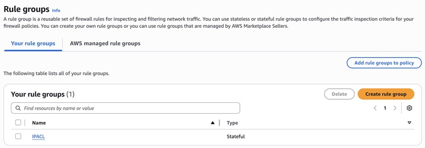 查看配置具体的同步情况,在此验证过程中,在 Firewall Manager 中添加了 rule group : IPACL ,可以看到子账号下的 NFW 已经同步了具体的 rule group 配置信息