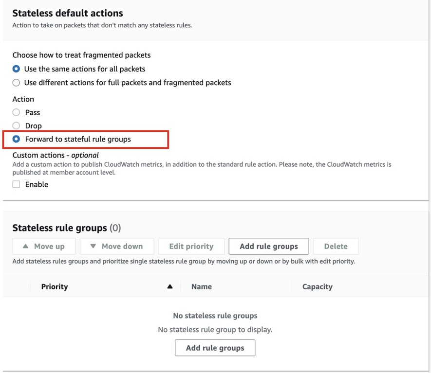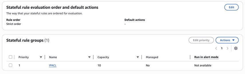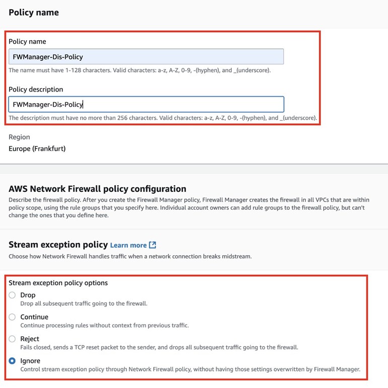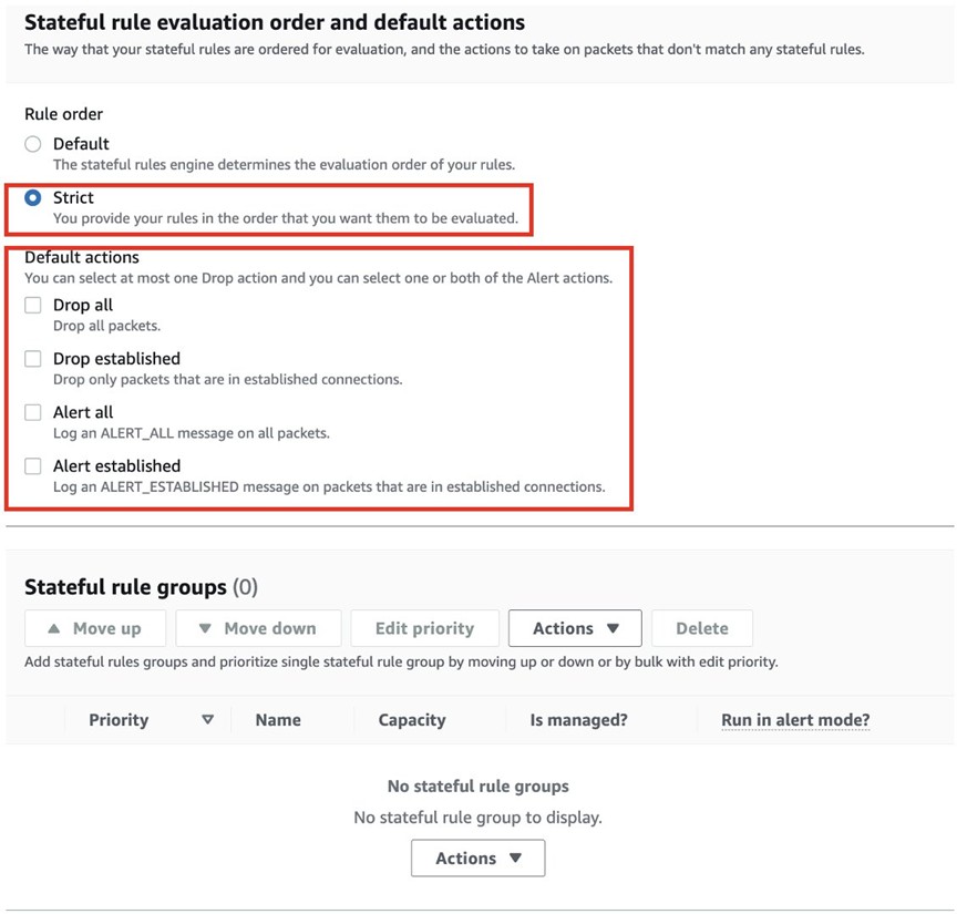 建议选择 Strict 按照顺序执行,在 default action 中按需选择,在 stateful rule group 中添加在 Firewall Manager Administrator 账户中创建的 Rule Group ,这里不详细介绍 Stateful rule 的配置细节,主要关注在 Firewall Manager 创建 NFW 的流程上。