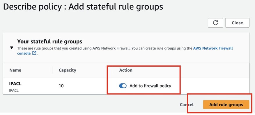 可以将 Firewall Manager Administrator 账户中创建的Rule Group关联到此 policy 中。