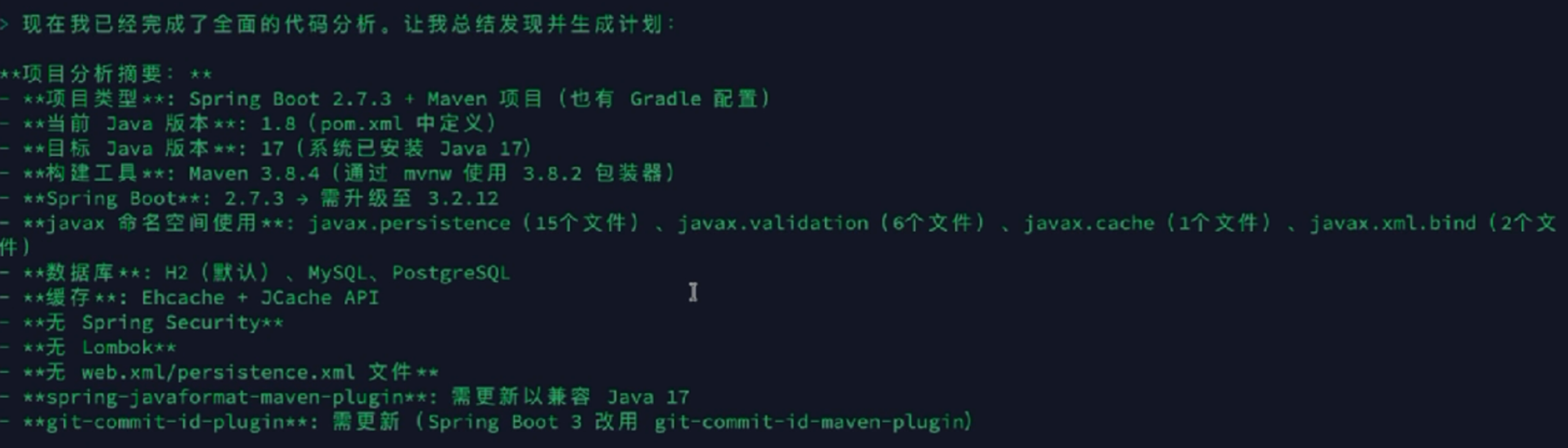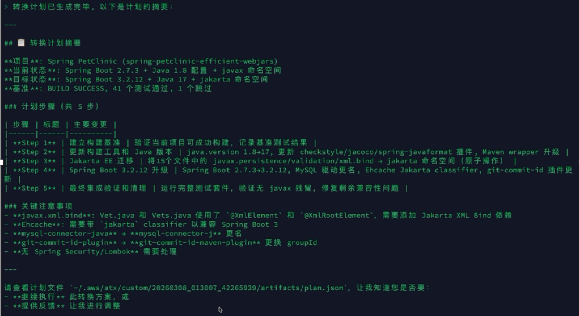 基于初步扫描结果,Agent 生成一份升级计划,列出需要变更的依赖版本、需要替换的废弃 API、需要迁移的命名空间等。