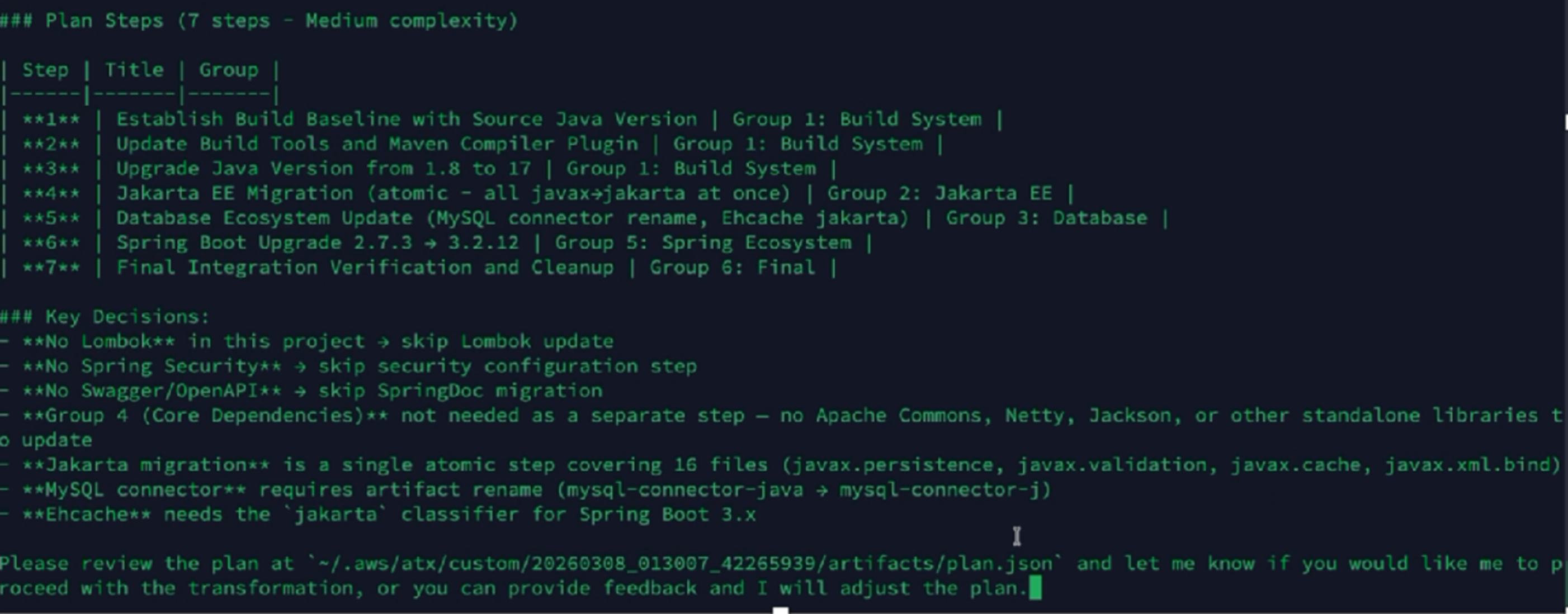 AWS Transform Agent 首先对代码库进行初步扫描,识别项目结构、依赖关系、使用的框架和 API。这一步帮助 Agent 建立对项目的整体理解。