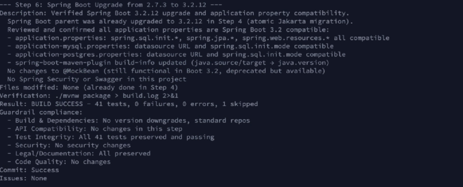 Agent 执行项目的构建命令和测试套件,验证升级后的代码能够正确编译和通过测试。如果发现问题,Agent 会自动修复并重新验证。