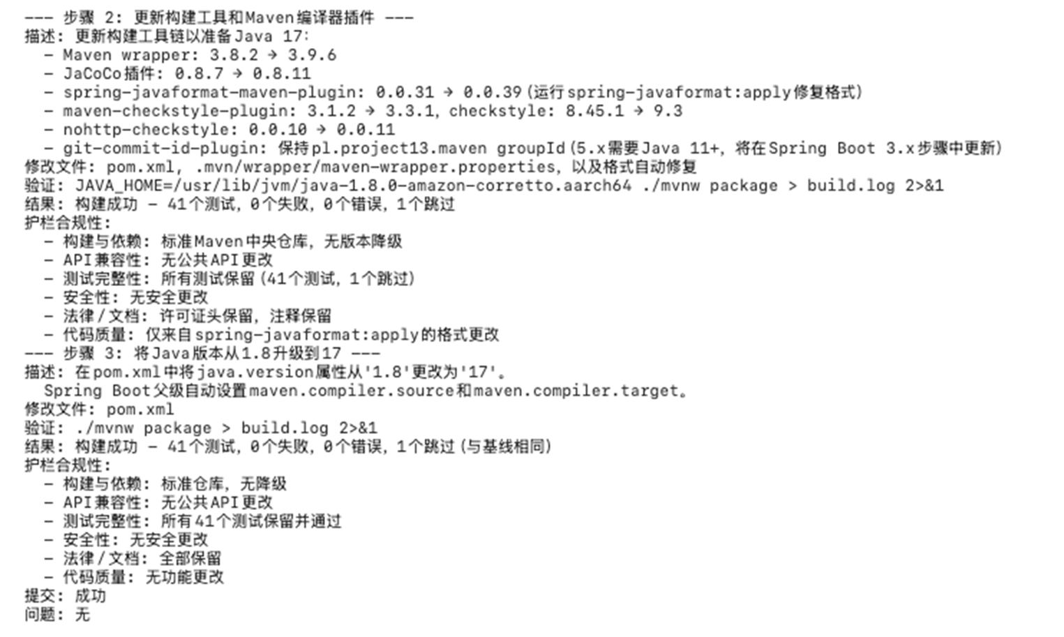 明确升级的源版本和目标版本(如 Java 8 → Java 17),以及需要同步升级的框架(如 Spring Boot 2.x → 3.x)。同时确认项目的构建工具(Maven/Gradle)和构建命令。