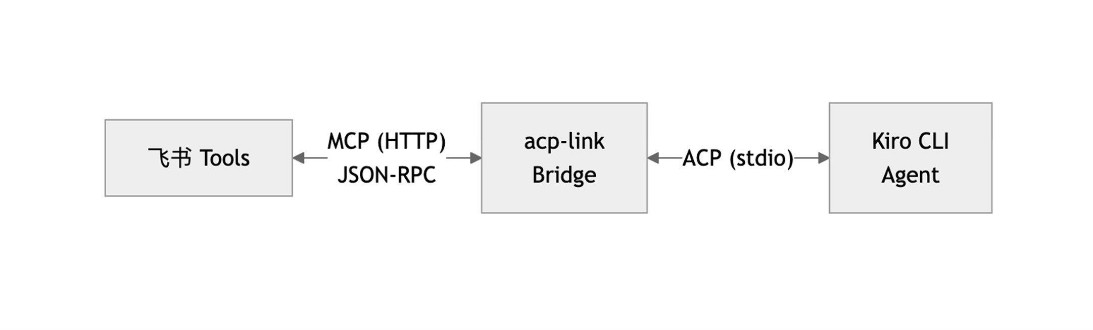 这正是我们做的事情。我们构建了 acp-link——一个将飞书与 Kiro CLI 通过 Agent Client Protocol (ACP) 连接的桥接服务。最终效果:一个具备流式响应、工具调用、文件处理和多轮对话能力的 AI 聊天机器人,全部由 Kiro 的 Agent 运行时驱动。