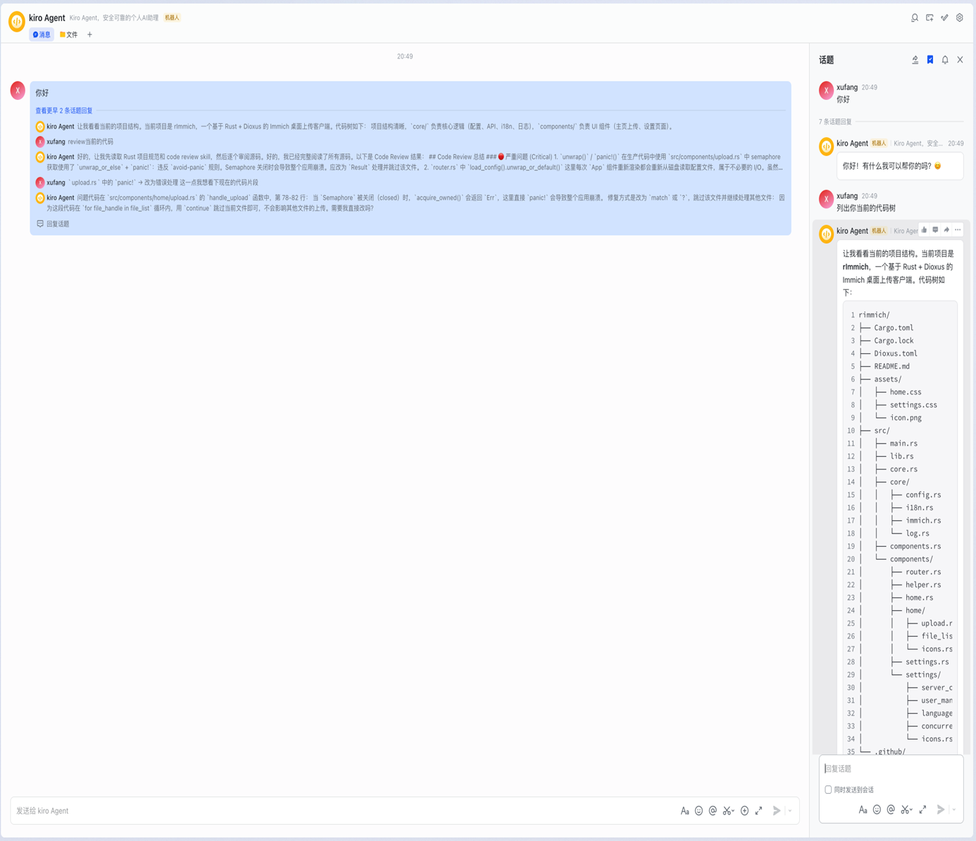 我们为团队配置了一个专属的 Code Review Agent,团队成员在飞书话题中发送代码审查请求,Agent 自动分析项目结构并给出专业反馈。