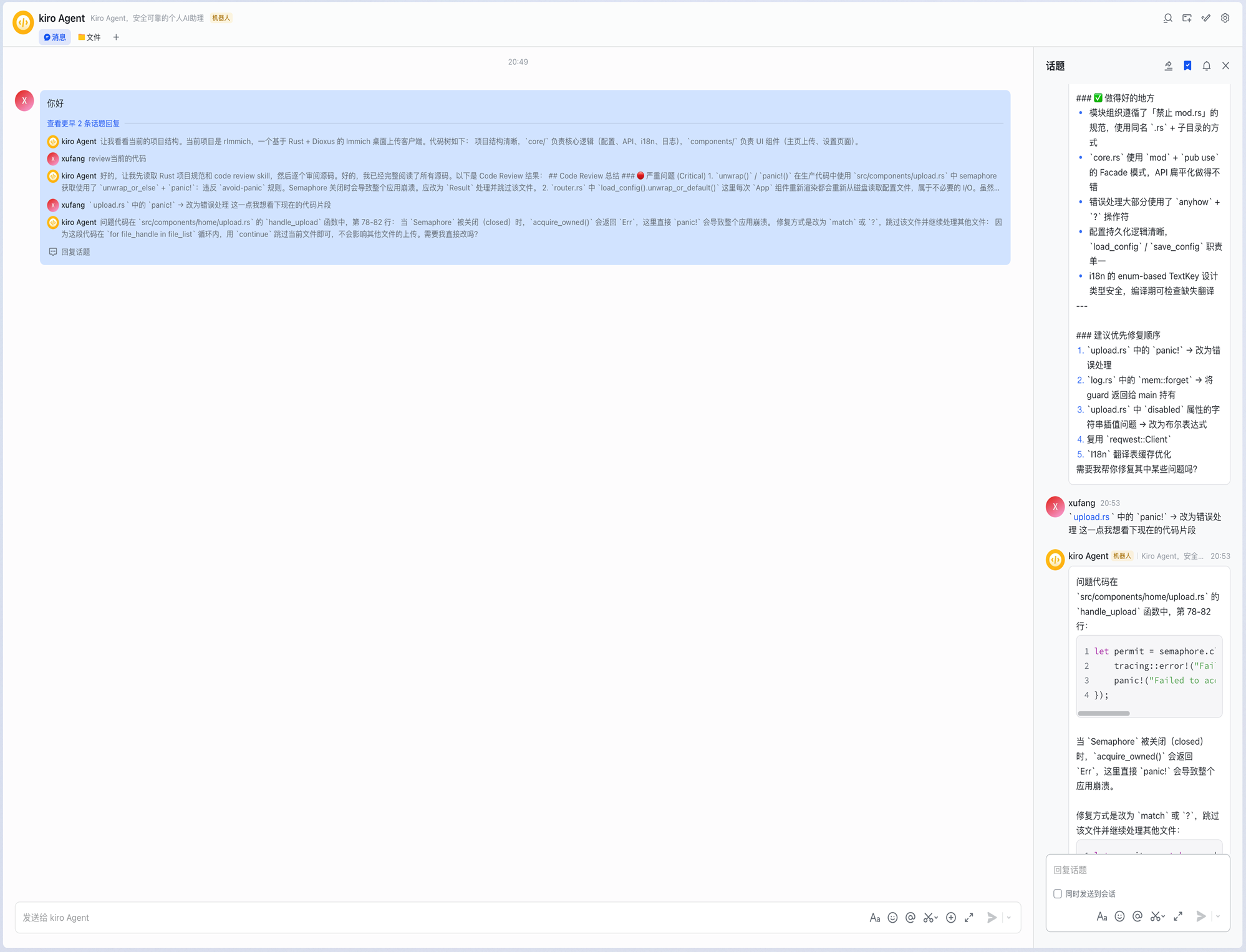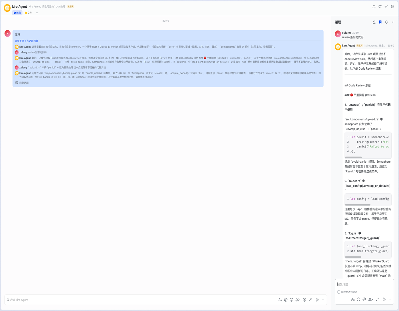 最终,Agent 输出一份按严重等级分类的 Code Review 报告,包含具体的代码位置、问题描述和修改建议。团队成员可以在话题中继续追问,深入探讨具体问题。