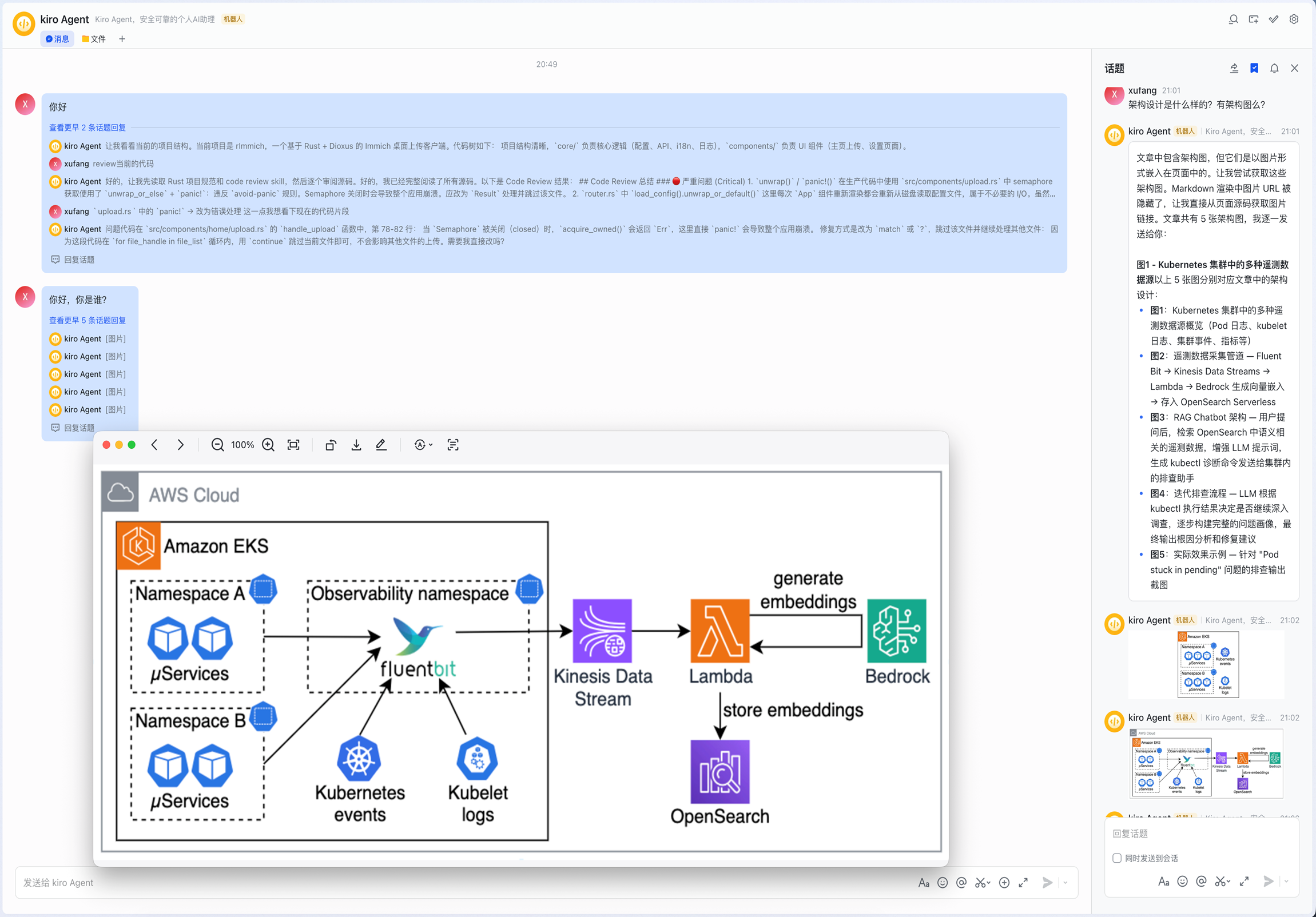 3. 流式回传响应——Kiro CLI 的流式输出被累积并以消息卡片的形式实时更新到飞书,工具调用状态也会同步展示(例如”正在搜索文档……”)