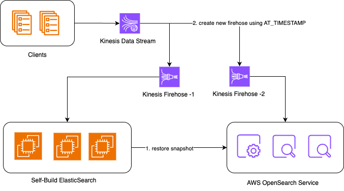 它特别适用于如下基础架构:客户端→ Amazon Kinesis Data Stream → Amazon Kinesis Firehose → OpenSearch; 此时可以通过添加两个Firehose[2]传输来分别指向源与目标集群来达到双写目的。