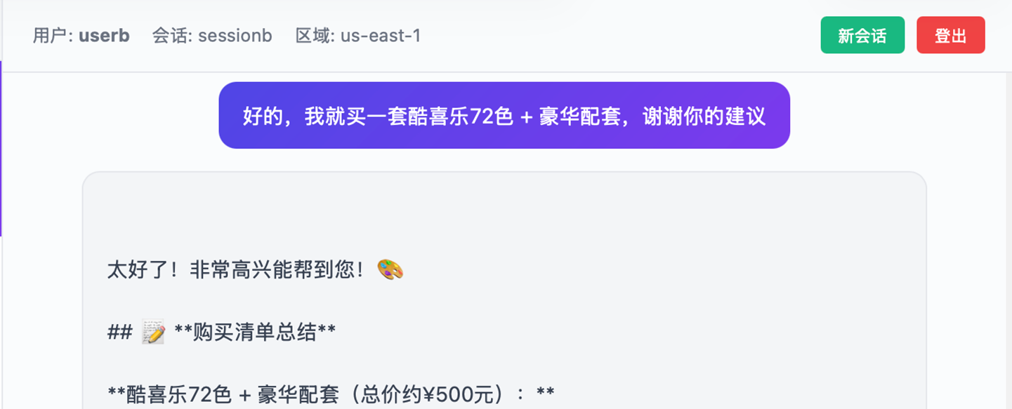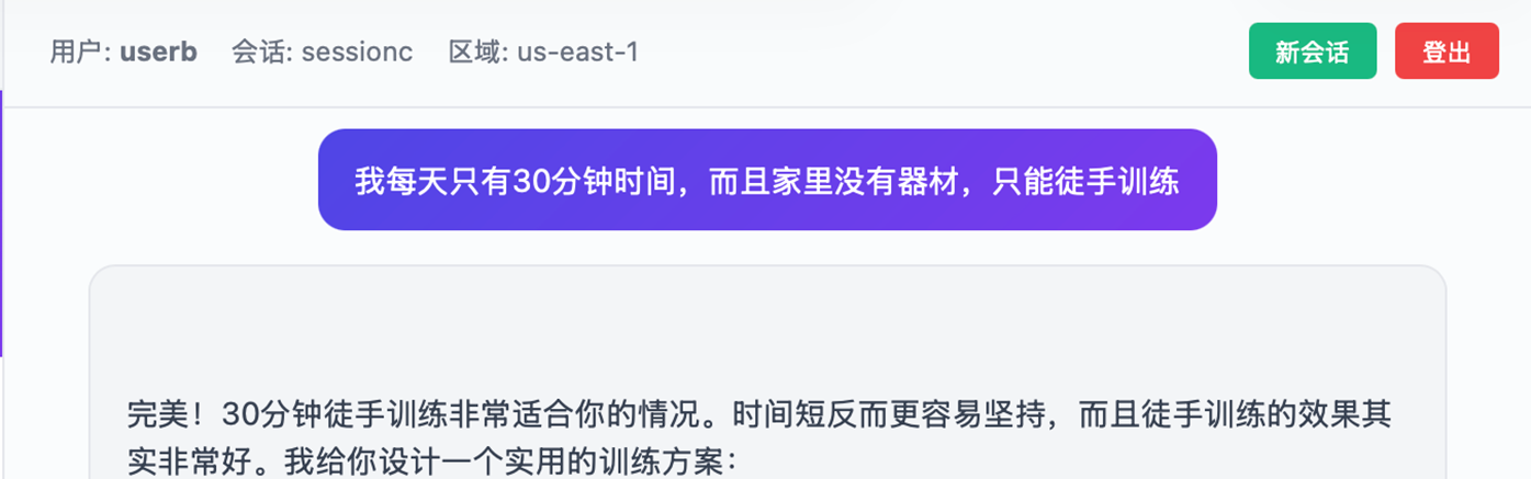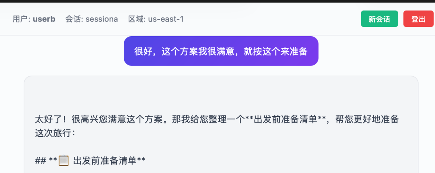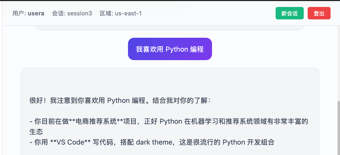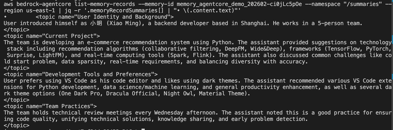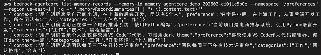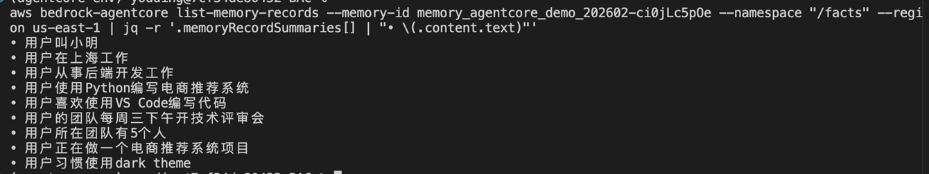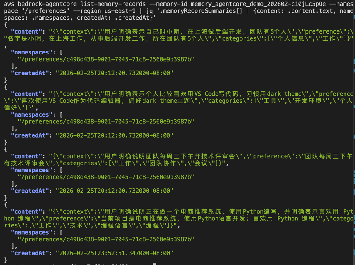 以下 Demo 基于已部署的 AgentCore 环境,使用 Strands Agent 框架集成 Memory。
