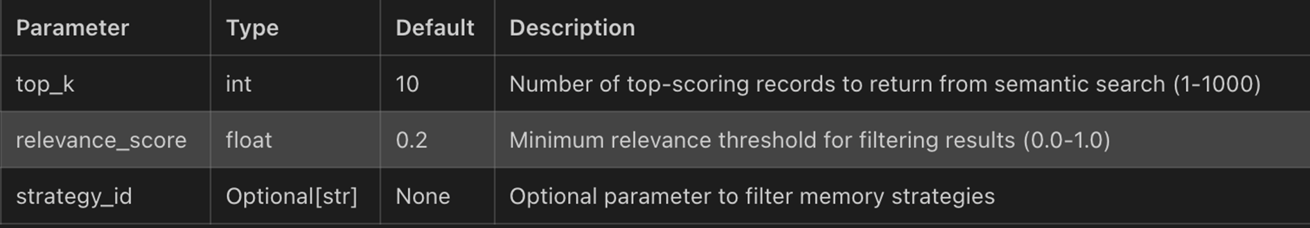 relevance_score:相关性门槛。只有语义相似度达到这个分数的记忆才会返回。比如设 0.3 是比较宽松的,大部分相关内容都能捞到;设 0.7 就很严格,只有高度相关的才返回。