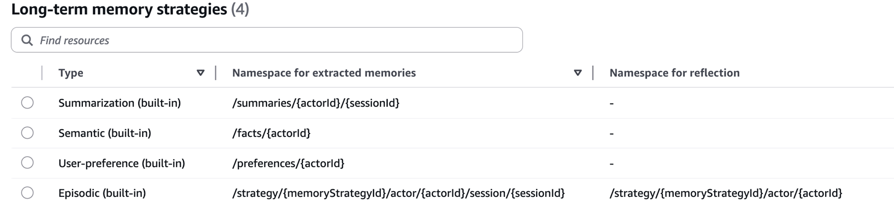 - Episodic: /strategy/{memoryStrategyId}/actor/{actorId}/session/{sessionId}