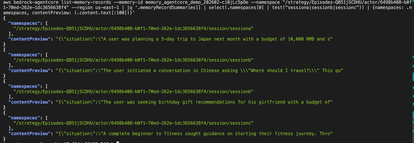 namespace 的 key(如 /facts/{actorId}):决定从哪个“记忆分区“检索。不同策略存在不同 namespace 下,你可以选择性地只检索某些策略的记忆。