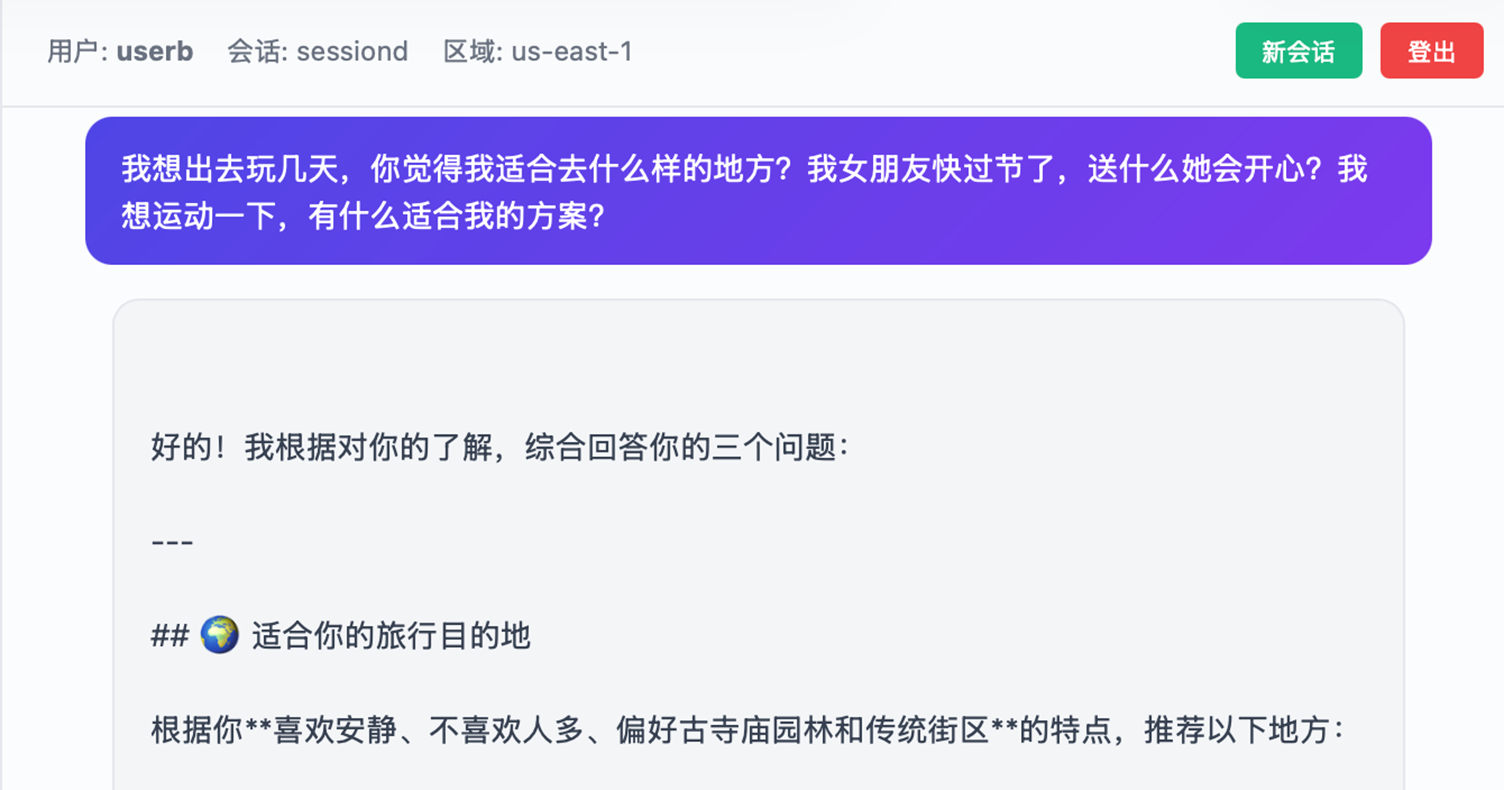 以上通过 3 个多轮会话(旅行规划、送礼建议、健身计划),每个都有完整的“提问→讨论→决策→确认“过程,Episodic 策略自动识别出完整的交互片段生成 episode,并从多个 episode 中提炼出 reflection。新会话里问相关问题时,Agent 能直接调用这些经验回答,不需要用户重复背景信息。