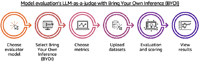 全部打开借助基于 BYOI 的 LLMaaJ 评估工作流,可以利用 Amazon Bedrock 模型评估功能对想使用的模型输出进行系统性评估。该工作流的使用流程简单,具体包括:选择评估器模型并配置 BYOI、选择合适的指标、上传评估数据集、运行评估,最后分析评估结果。无论 AI 应用部署在哪里,这条完整的评估管道(如下图所示)均可在 AI 应用实现过程中保证其输出质量。