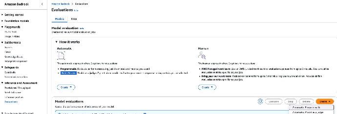 - 在 Model evaluations(模型评估)区域,点击 Create(创建),然后选择 Automatic: Model as a judge(自动:将模型作为评判者)。