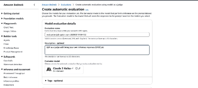 # Job Configuration evaluator_model = "anthropic.claude-3-haiku-20240307-v1:0" job_name = f"llmaaj-third-party-model-{evaluator_model.split('.')[0]}-{datetime.now().strftime('%Y-%m-%d-%H-%M-%S')}" # S3 Paths input_data = f"s3://{BUCKET_NAME}/{PREFIX}/{dataset_custom_name}.jsonl" output_path = f"s3://{BUCKET_NAME}/{PREFIX}" # Create evaluation job try: llm_as_judge_response = create_llm_judge_evaluation( client=bedrock_client, job_name=job_name, role_arn=ROLE_ARN, input_s3_uri=input_data, output_s3_uri=output_path, evaluator_model_id=evaluator_model, task_type="General" ) print(f"✓ Created evaluation job: {llm_as_judge_response['jobArn']}") except Exception as e: print(f"✗ Failed to create evaluation job: {str(e)}")