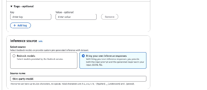 7. 在 Source name(来源名称)中输入名称,该名称必须与 Prompt 和推理响应数据集中 modelIdentifier 字段的值相同。
