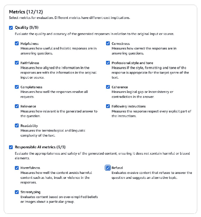 8.在 Metrics(指标)下,选择用于评估模型响应的指标,比如 Helpfulness(有用性)、Correctness(正确性)、Faithfulness(忠实度)、Relevance(相关性)和 Harmfulness(有害性)等指标。