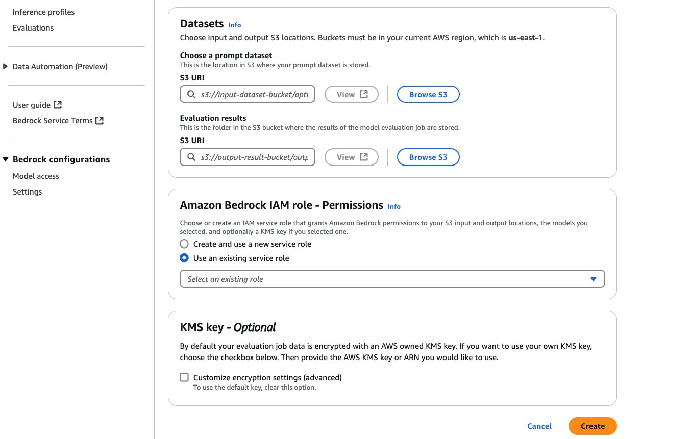 1.设置必要的配置,包括:评估器模型标识符、IAM 角色和权限、存储推理响应输入数据的 S3 路径,以及存储输出结果的 S3 路径: