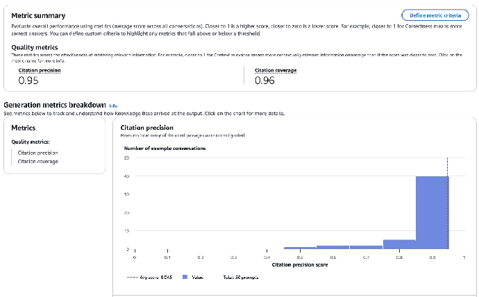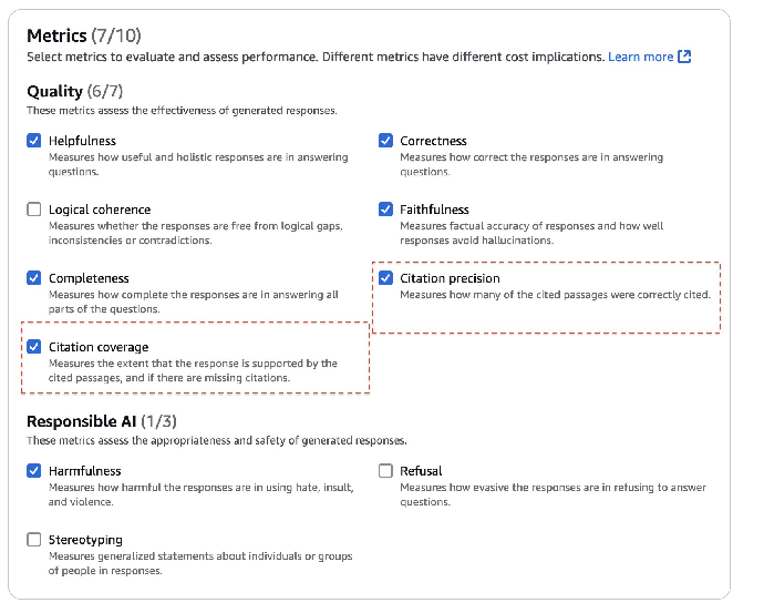 RAG 评估能力支持在 Amazon Bedrock 评估环境中评估托管在任何地方的 RAG 系统的输出。使用 Bring Your Own Inference Responses (BYOI) 功能,你只需提供满足格式要求的响应数据,即可评估多个来源的检索和生成结果,包括其他服务商提供的基础模型、自建 RAG 系统或已部署的开放权重解决方案。此外,我们在此前已发布的质量评估指标和负责任的 AI 评估指标的基础上还引入了新的引用评估指标,可以帮助你更好地了解 RAG 系统对知识库和源文档的利用情况。
