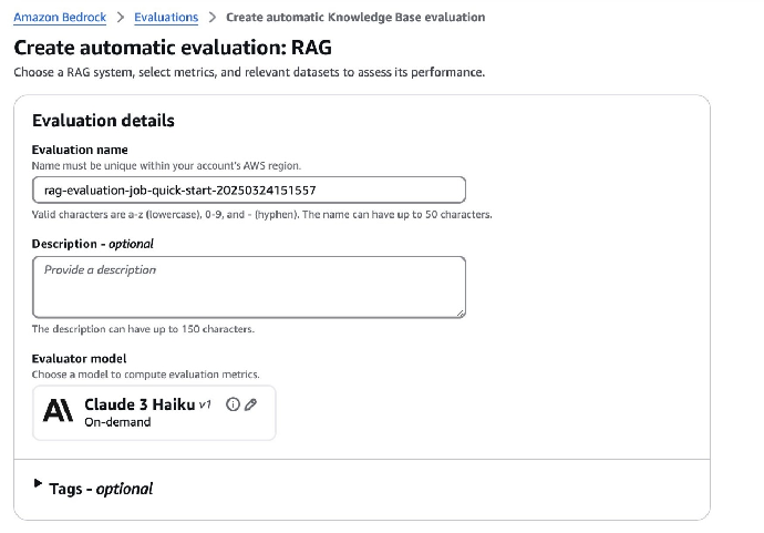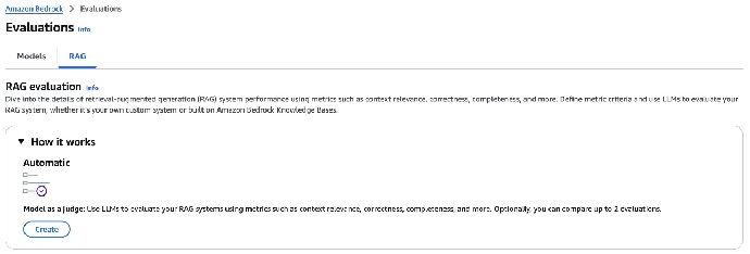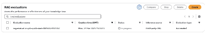 retrieve_generate_job_name = f"rag-evaluation-generate-{datetime.now().strftime('%Y-%m-%d-%H-%M-%S')}" retrieve_generate_job = bedrock_client.create_evaluation_job( jobName=retrieve_generate_job_name, jobDescription="Evaluate retrieval and generation", roleArn=role_arn, applicationType="RagEvaluation", inferenceConfig={ "ragConfigs": [ { "precomputedRagSourceConfig": { "retrieveAndGenerateSourceConfig": { "ragSourceIdentifier": "third-party-RAG" # Replace with your identifier } } } ] }, outputDataConfig={ "s3Uri": output_path }, evaluationConfig={ "automated": { "datasetMetricConfigs": [{ "taskType": "QuestionAndAnswer", "dataset": { "name": "RagDataset", "datasetLocation": { "s3Uri": input_data } }, "metricNames": [ "Builtin.Correctness", "Builtin.Completeness", "Builtin.Helpfulness", "Builtin.LogicalCoherence", "Builtin.Faithfulness", "Builtin.CitationPrecision", "Builtin.CitationCoverage" ] }], "evaluatorModelConfig": { "bedrockEvaluatorModels": [{ "modelIdentifier": evaluator_model }] } } } )