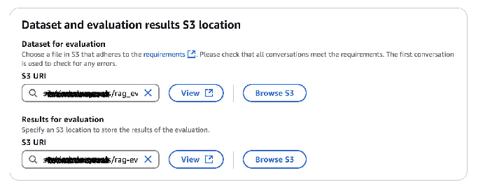 8. 在 Dataset and evaluation results S3 location(数据集和评估结果的 S3 位置)下,点击 Browse S3(浏览 S3),输入评估输入文件的 S3 URI 和输出文件的 S3 URI。