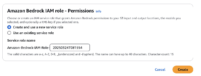 9. 在 Amazon Bedrock IAM role – Permissions(Amazon Bedrock 的 IAM 角色 – 权限)下,新建服务角色或使用已有角色。