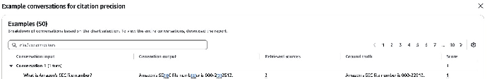 { "conversationTurns": [{ "prompt": { "content": [{ "text": "What is Amazon's SEC file number?" }] }, "referenceResponses": [{ "content": [{ "text": "Amazon's SEC file number is 000-22513." }] }], "output": { "text": "Amazon's SEC file number is 000-22513.", "modelIdentifier": "third-party-model", "knowledgeBaseIdentifier": "third-party-RAG", "retrievedPassages": { "retrievalResults": [{ "content": { "text": "Commission File No. 000-22513" } }, { "content": { "text": "AMAZON.COM, INC. (Exact name of registrant as specified in its charter)" } }] }, "citations": [{ "generatedResponsePart": { "textResponsePart": { "span": { "start": 0, "end": 11 }, "text": "Amazon's SEC" } }, "retrievedReferences": [{ "content": { "text": "UNITED STATESSECURITIES AND EXCHANGE COMMISSION" } }] }, { "generatedResponsePart": { "textResponsePart": { "span": { "start": 12, "end": 22 }, "text": "file number" } }, "retrievedReferences": [{ "content": { "text": "Commission File No. 000-22513" } }] }, { "generatedResponsePart": { "textResponsePart": { "span": { "start": 23, "end": 33 }, "text": "is 000-22513" } }, "retrievedReferences": [{ "content": { "text": "Commission File No. 000-22513" } }] }] } }] }