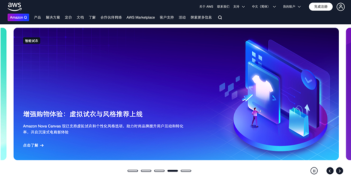 选择点击 AWS 主页面右上角“完成注册”按钮,注册一个全新的亚马逊云科技账户。页面跳转至 AWS 账户注册页面。