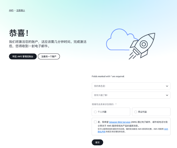 对于用户角色和兴趣,可以填写完毕,然后点击“提交”。提交表单后,账户退出。