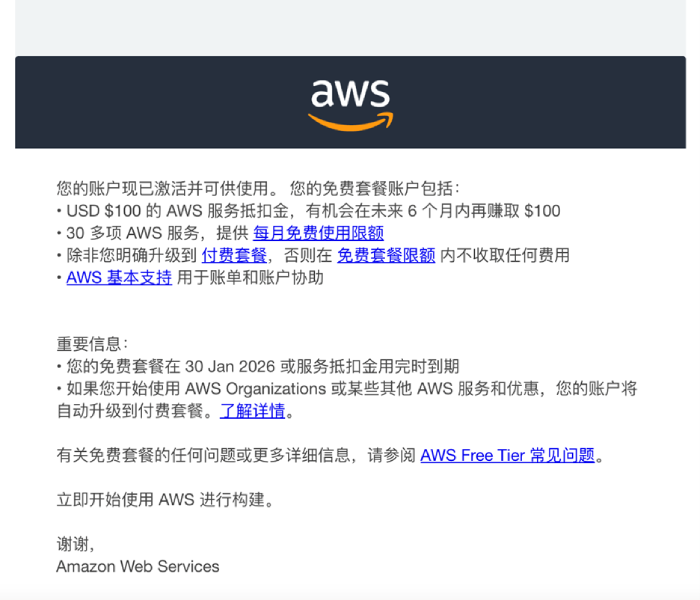 同时,账户注册邮箱收到新用户免费套餐邮件,如下图所示。这说明,本次注册 AWS 新账户,可以充分享受 Free Tier 免费套餐。