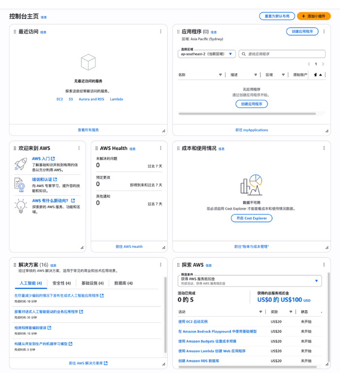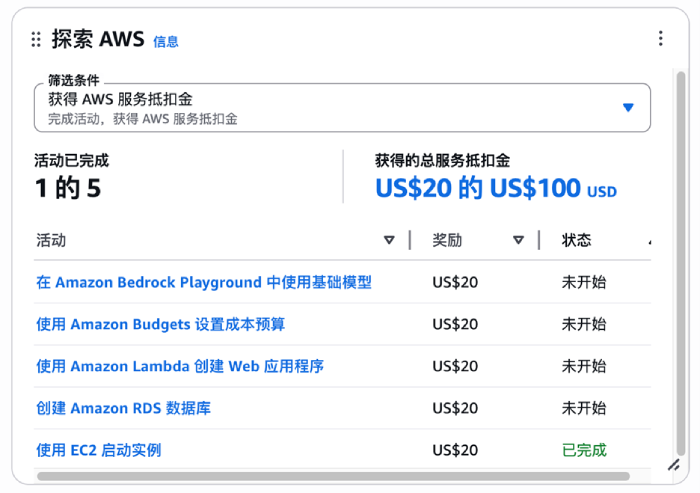 - 完成入门任务再得 100 美元服务抵扣金:在 AWS 管理控制台的“探索 AWS”小组件中,完成五个入门任务,每完成一个任务即可获得 20 美元的服务抵扣金,总计可获得额外 100 美元。