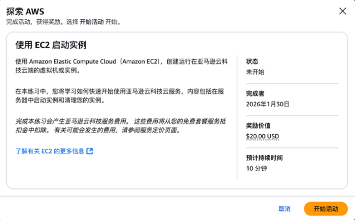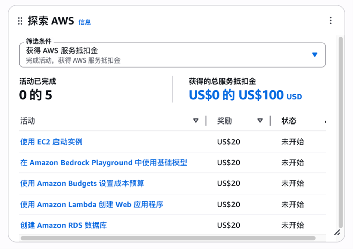 其中,右下角“探索 AWS ”部分,显示出完成活动可获得总服务抵扣金 100 美元的活动清单。如下图。
