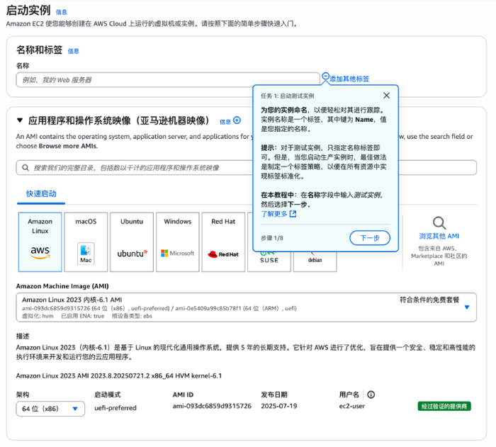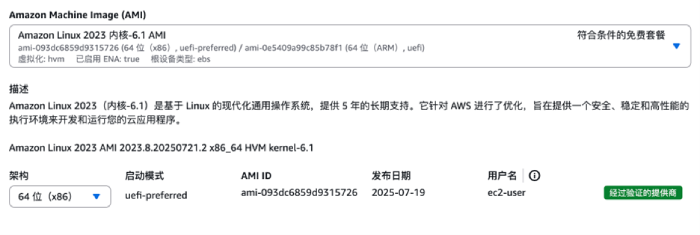 对于新用户而言,可选免费的操作系统作为亚马逊机器映像例如:Amazon Linux,它是符合条件的免费套餐选项,按照默认的 Amazon Linux 2023 作为操作系统,其内核架构为 64 位,最新发布日期为 2025 年 7 月 19 日,也是经过验证的提供商。如下图。