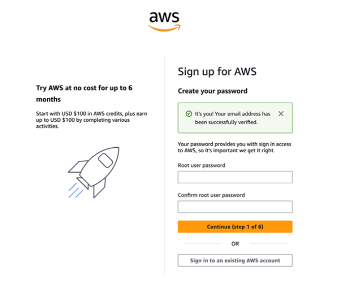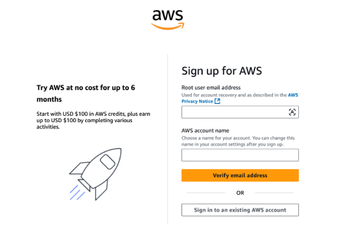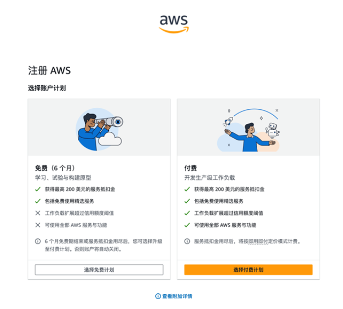 - 免费计划账户:您可以在注册后的 最多 6 个月内,在免费账户计划下使用 AWS 服务,期间无需支付费用。