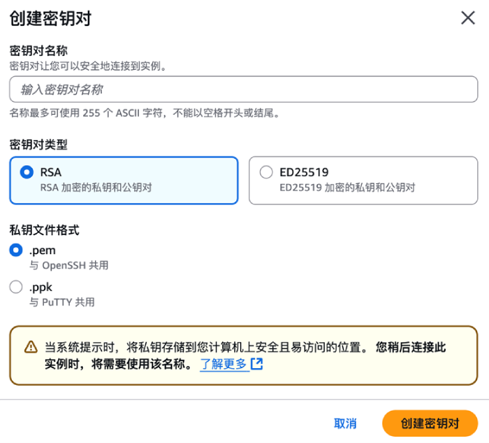 点击“创建新密钥对”,即可创建新的密钥对,如下图所示。输入名称后,选择密钥对类型(RSA 或者 ED25519),以及私钥文件格式(.pemh 或者 .ppk),点击“创建密钥对”完成创建。由于该项是必填项,因此必须输入密钥对信息。