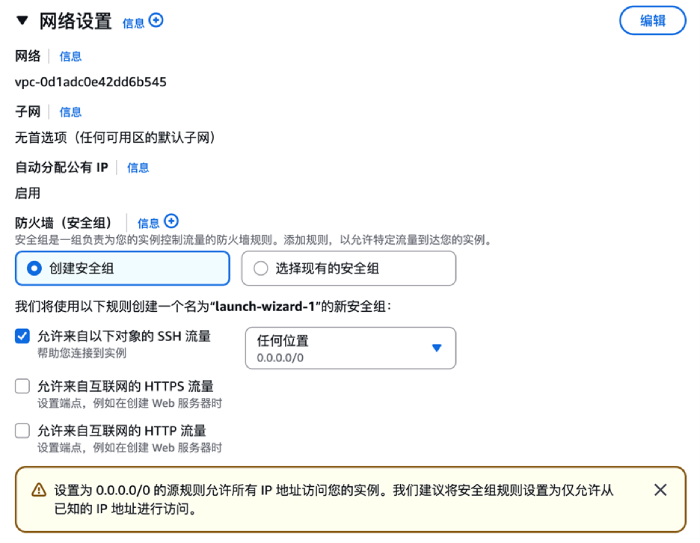 将为测试实例创建安全组,以允许来自任何未知的流量。以下图中复选项包含“允许来自以下对象的 SSH 流量(任何位置 0.0.0.0/0)。