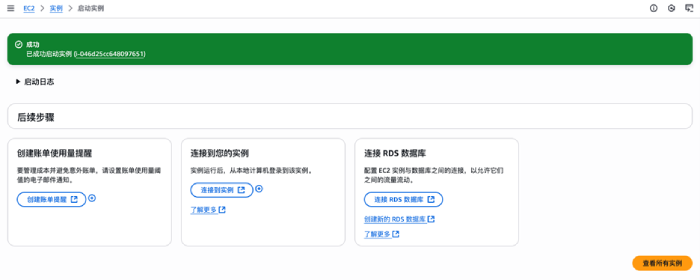 当点击“启动实例”后,AWS 迅速启动该实例,很快显示启动成功!