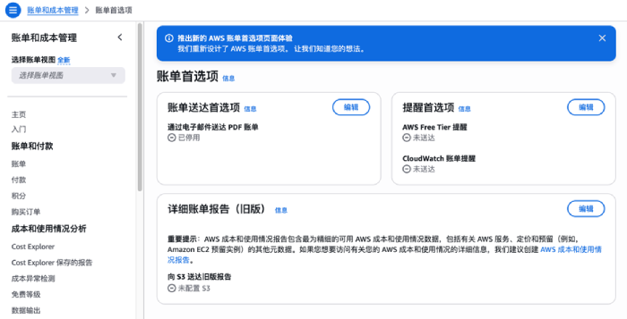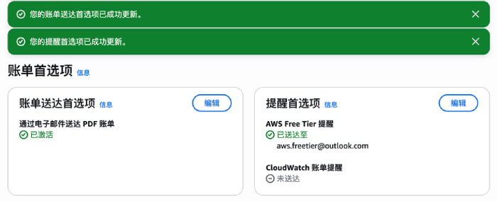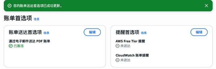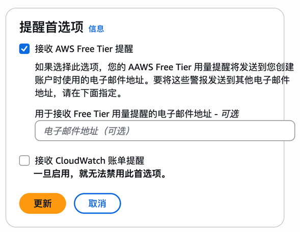 对于新用户的 AWS Free Tier 提醒,经过编辑,选择“接收 AWS Free Tier 提醒“,如下图所示。点击“更新”后,提醒首选项状体更新,会用接收邮件的方式提醒 Free Tier 用量。