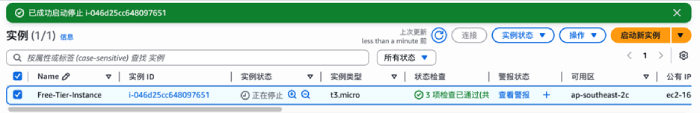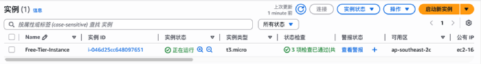 在 AWS 控制台页面,选择 EC2 后,看到已创建的 EC2 实例,如下图。至此,关于 Free Tier 新用户免费套餐的第一项活动任务 – 启动 EC2 实例顺利完成了!