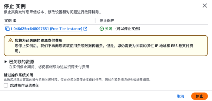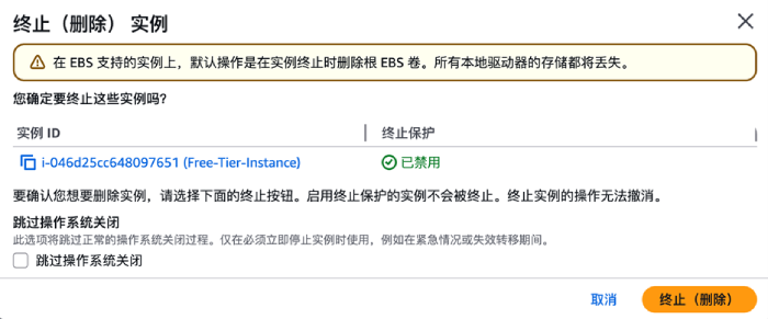 *警示:终止(删除)实例后,该实例存储在 EBS 卷上的数据都将丢失。