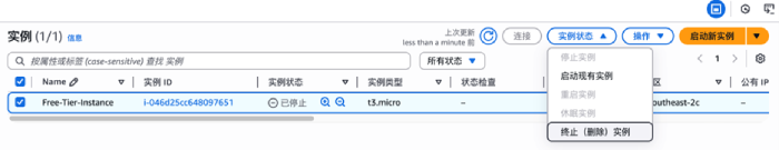 选择该测试实例,在“实例状态”下拉菜单“中选择”停止实例“。
