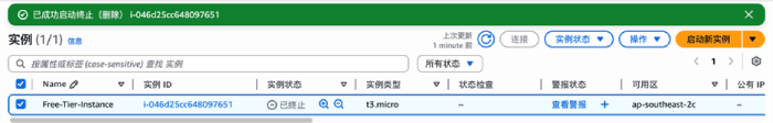 点击“终止(删除)”按钮。页面更新为“已成功启动终止(删除)实例…”,