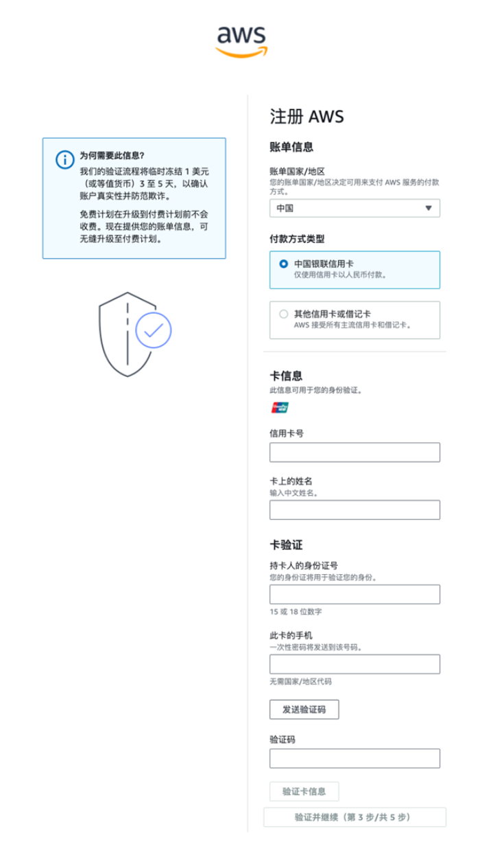 新用户须选择“付款方式类型“,填写“信用卡号”,并进行卡验证,完成后点击“验证并继续(第 3 步/共 5 步)继续下一步。