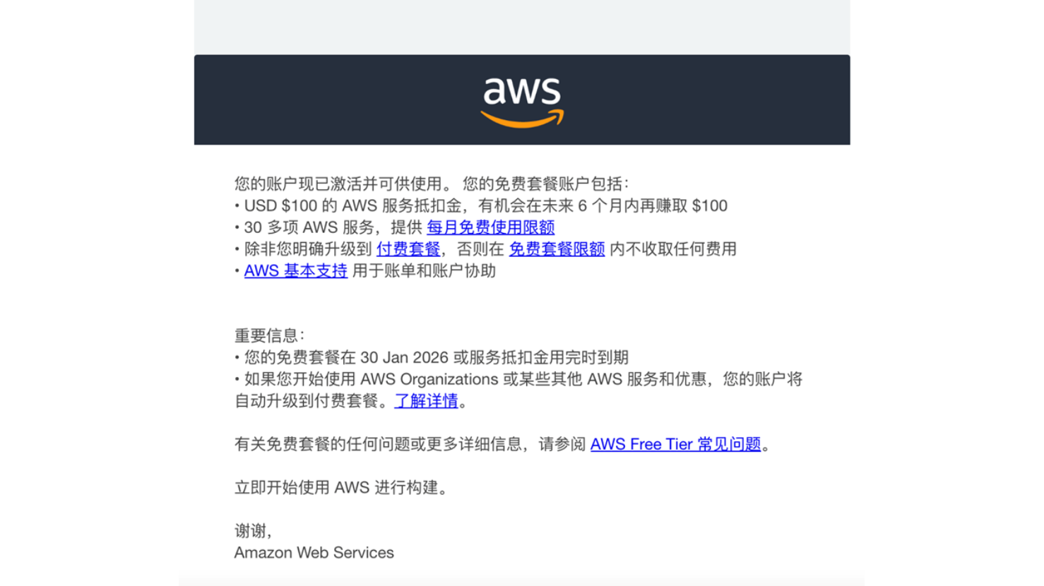 同时,账户注册邮箱收到新用户免费套餐邮件,如下图所示。这说明,本次注册 AWS 新账户,可以充分享受 Free Tier 免费套餐。