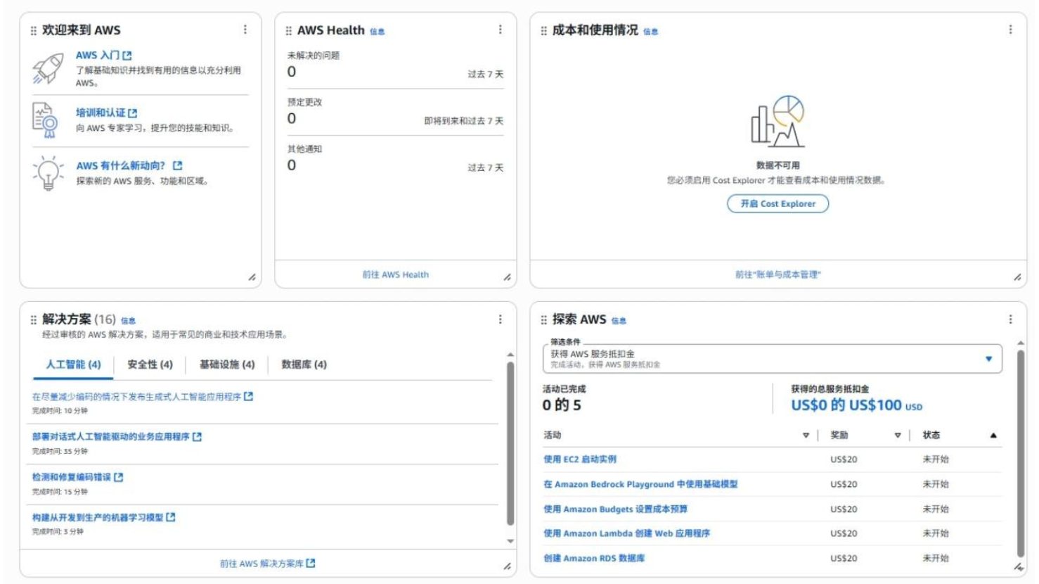- 完成入门任务再得 100 美元服务抵扣金:在 AWS 管理控制台的“探索 AWS”小组件中,完成五个入门任务,每完成一个任务即可获得 20 美元的服务抵扣金,总计可获得额外 100 美元。